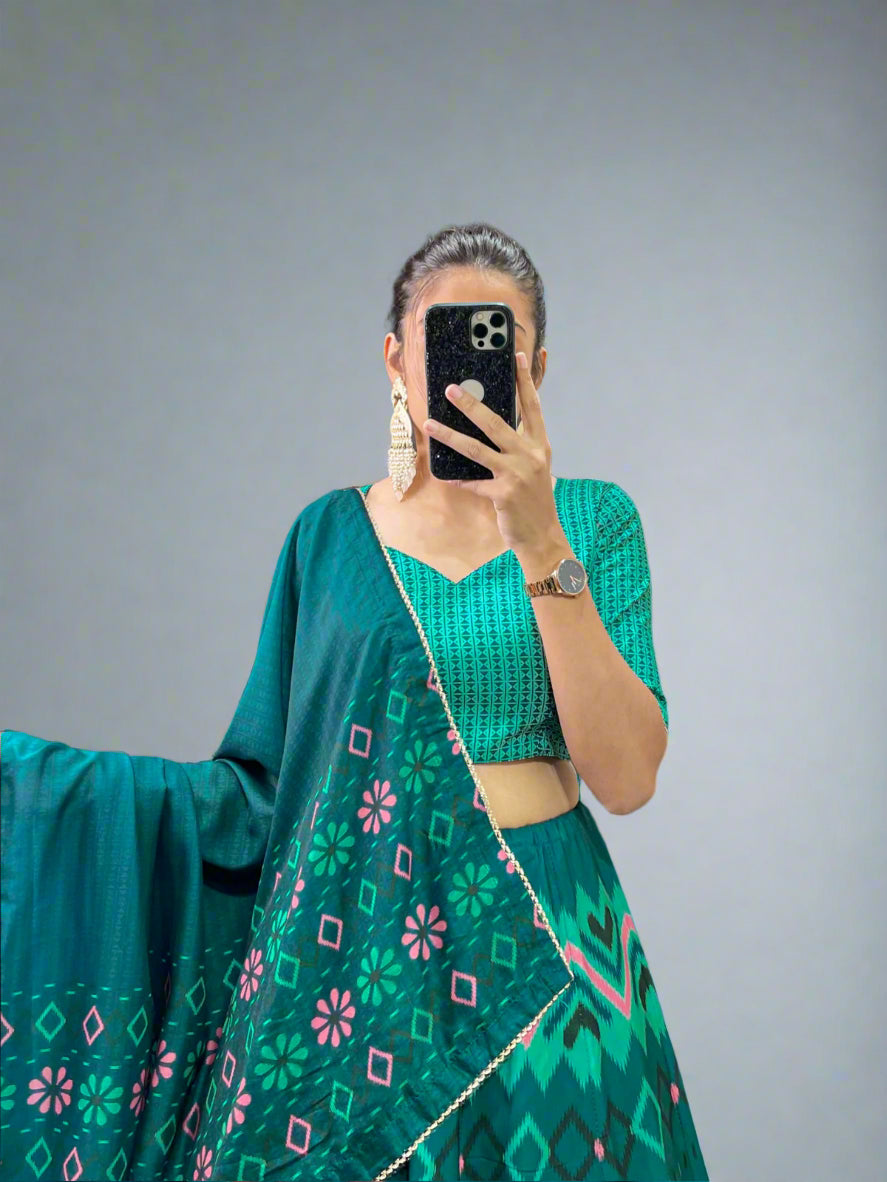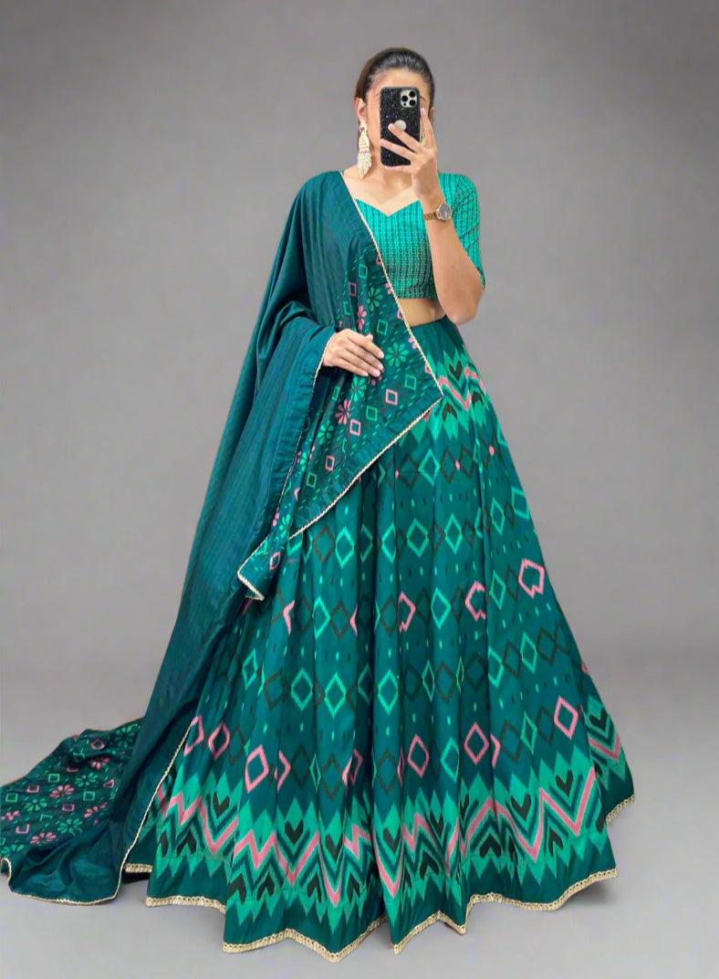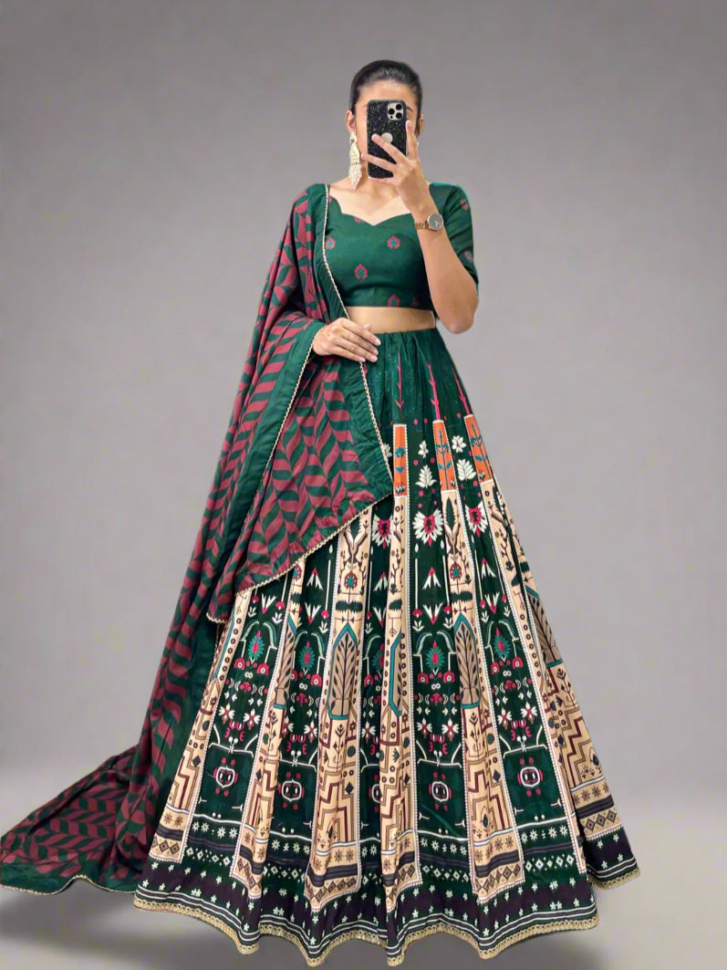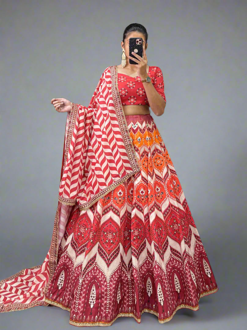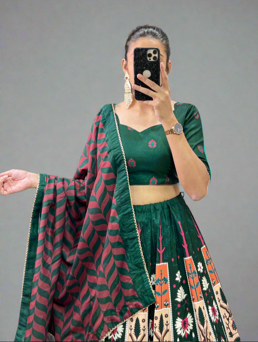 Step into timeless elegance with this stitched printed Vaishali silk lehenga, designed for comfort and grace. Featuring a 4.3-meter flare, micro cotton inner lining, and can-can, this lehenga offers a structured yet flowy silhouette. The side zipper closure with a drawstring ensures an adjustable fit, supporting up to a 42" waist.