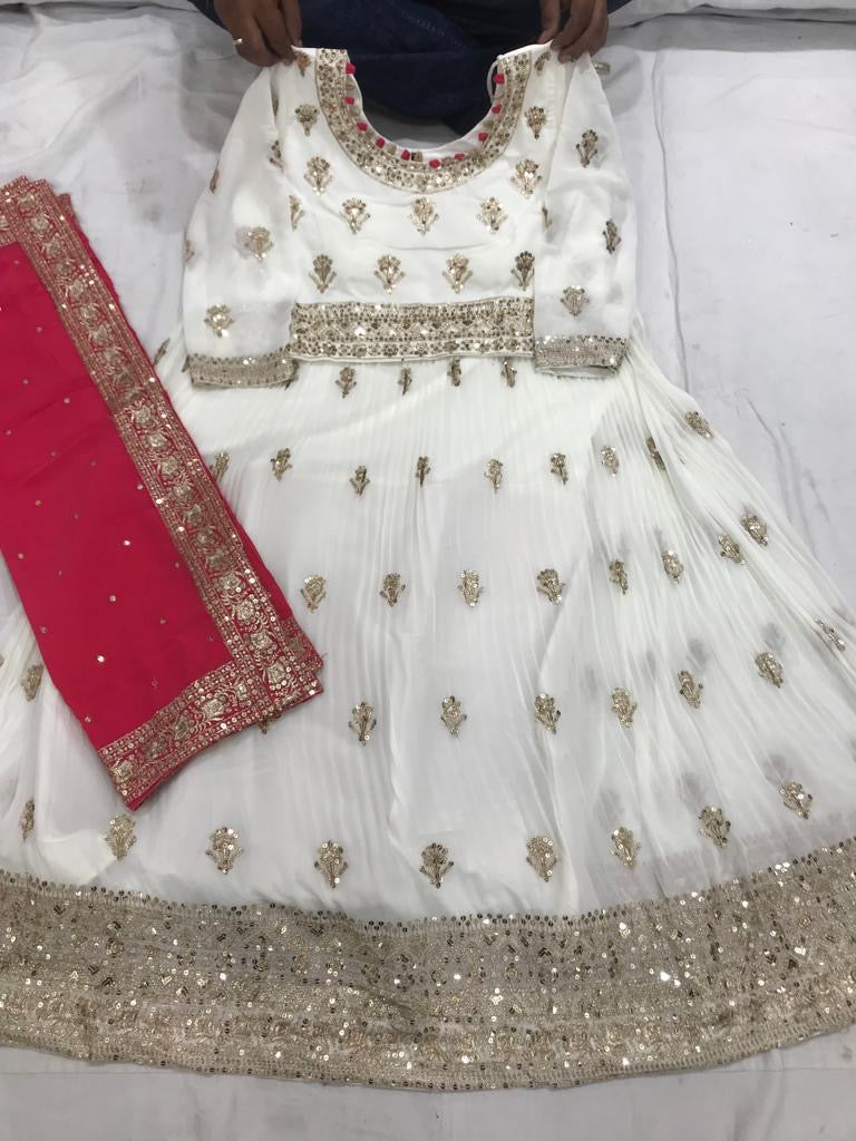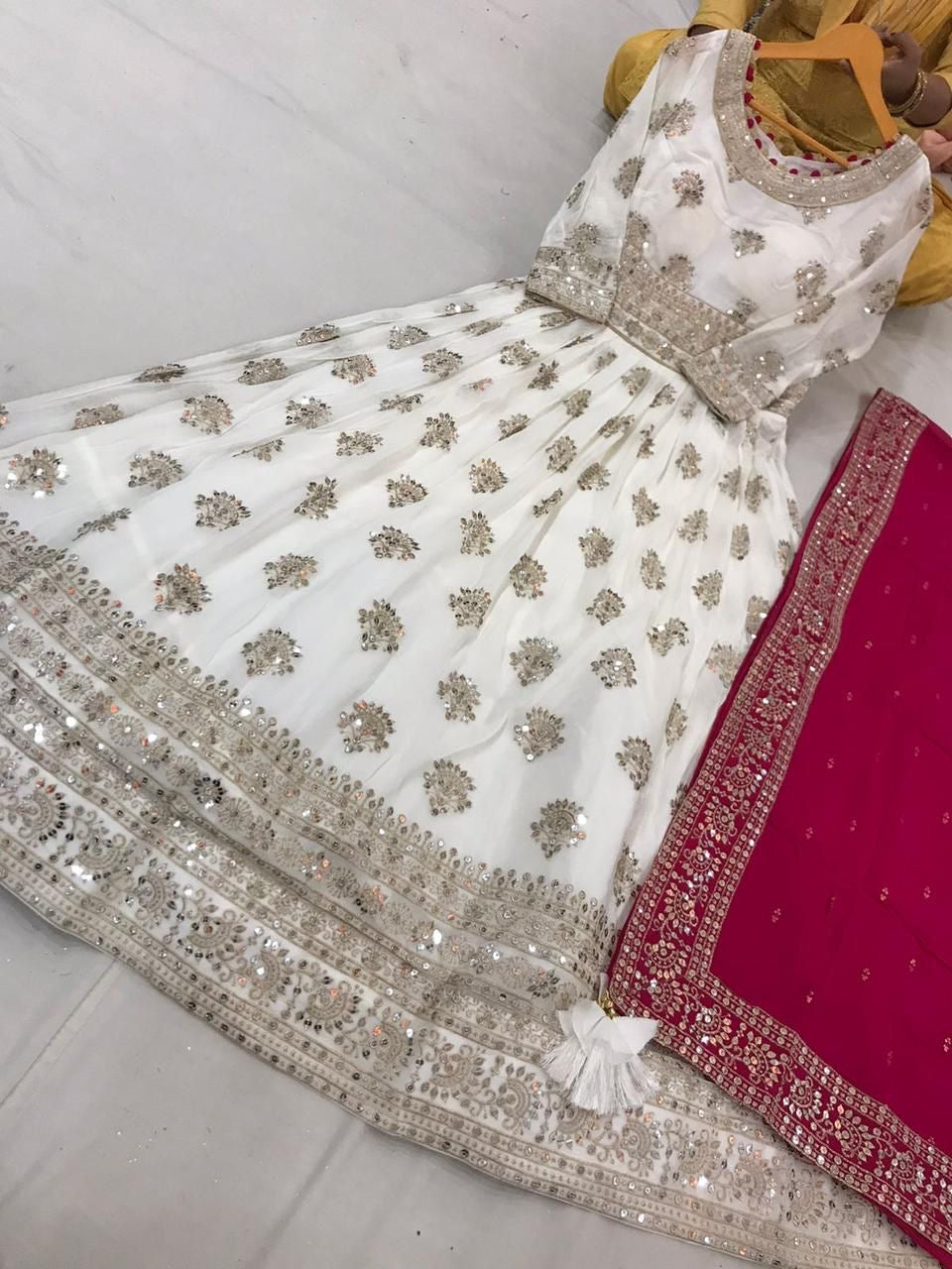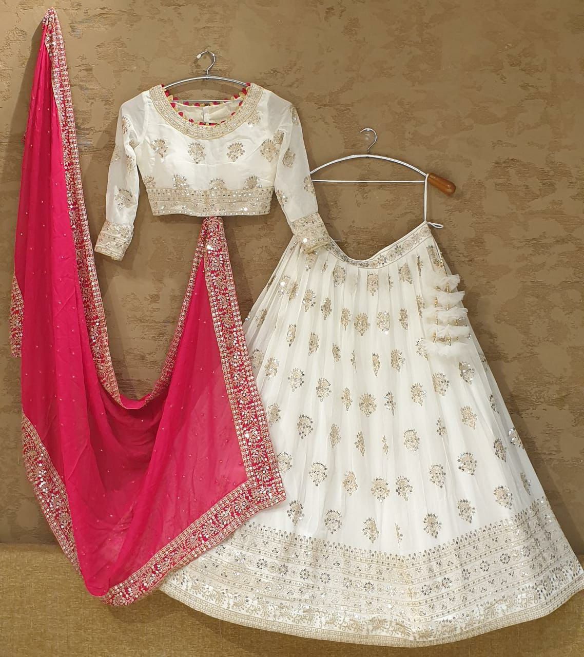 Make a bold yet graceful statement with this stylish white georgette lehenga set, featuring a striking hot pink contrast dupatta and intricate embroidery for a sophisticated look.