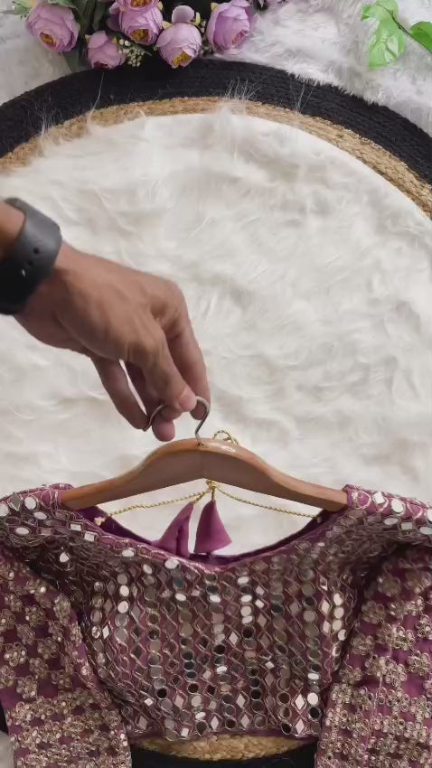 Paired with the saree is a fully stitched heavy faux georgette blouse, beautifully embellished with heavy embroidery on the front, back, and sleeves. The blouse showcases original mirror handwork and is finished with decorative beading on the sleeve cuffs, enhancing its designer appeal and ready-to-wear convenience.