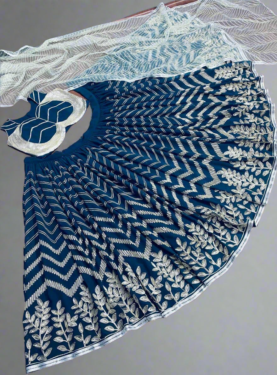 Make a statement in this exquisite navy blue semi-stitched lehenga, crafted from heavy fox georgette and adorned with intricate silver embroidery. The lehenga features a soft cotton inner lining for comfort and can-can for added volume, creating a regal silhouette.