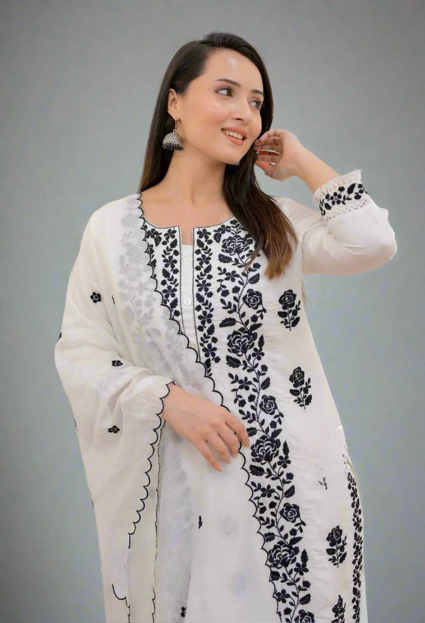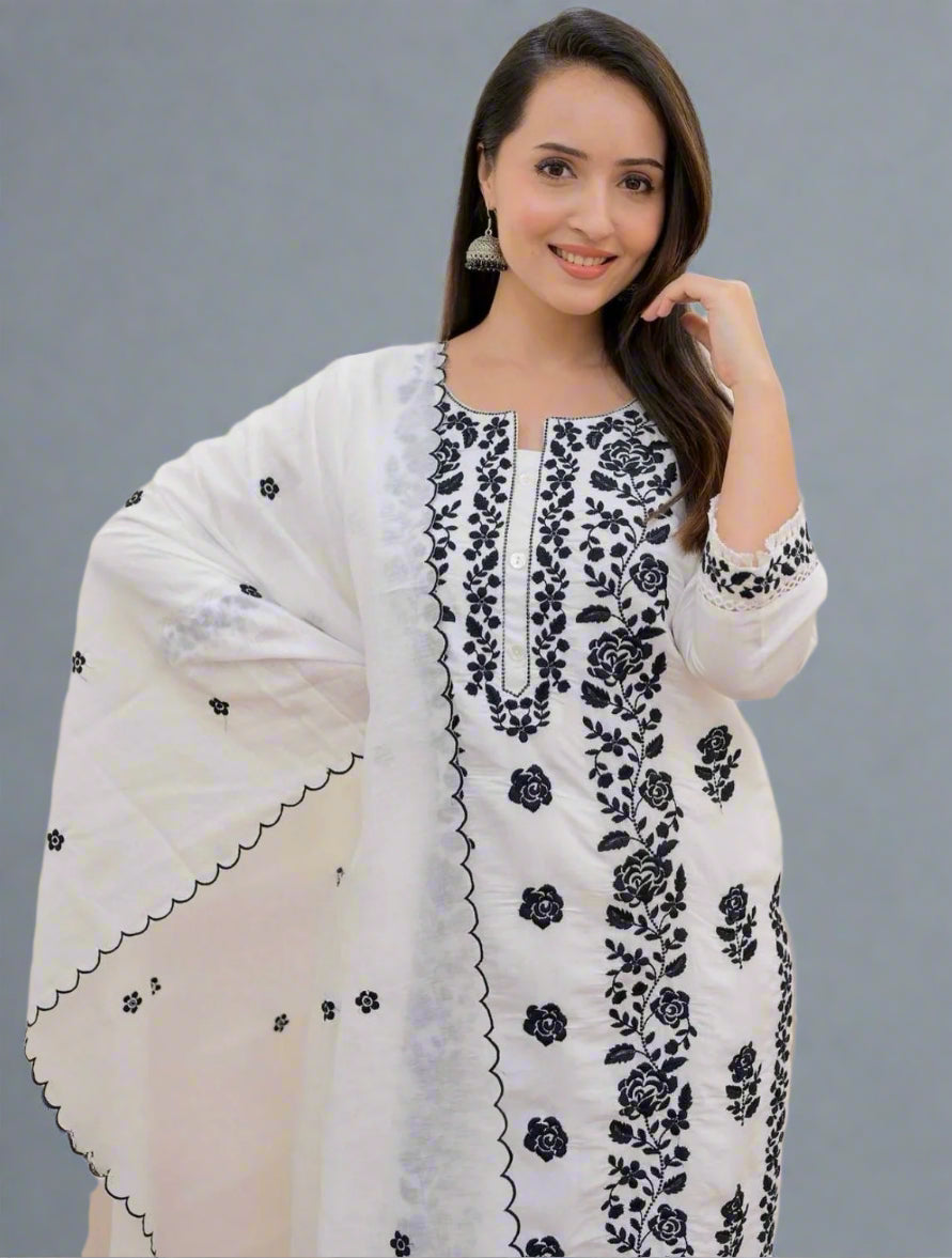 Experience timeless grace with this unstitched white cotton silk ensemble, beautifully adorned with black muslin embroidery work for a striking contrast. Perfect for festive occasions, formal gatherings, and everyday elegance, this 3-piece set offers a blend of sophistication and comfort.